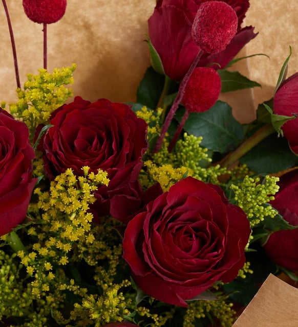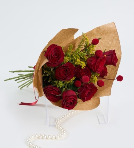 Kraft buket içerisinde özenle yerleştirilmiş kırmızı güller ve kişiye özel stickerlı çerçeve ile sevdiklerinize unutulmaz bir sürpriz sunar.